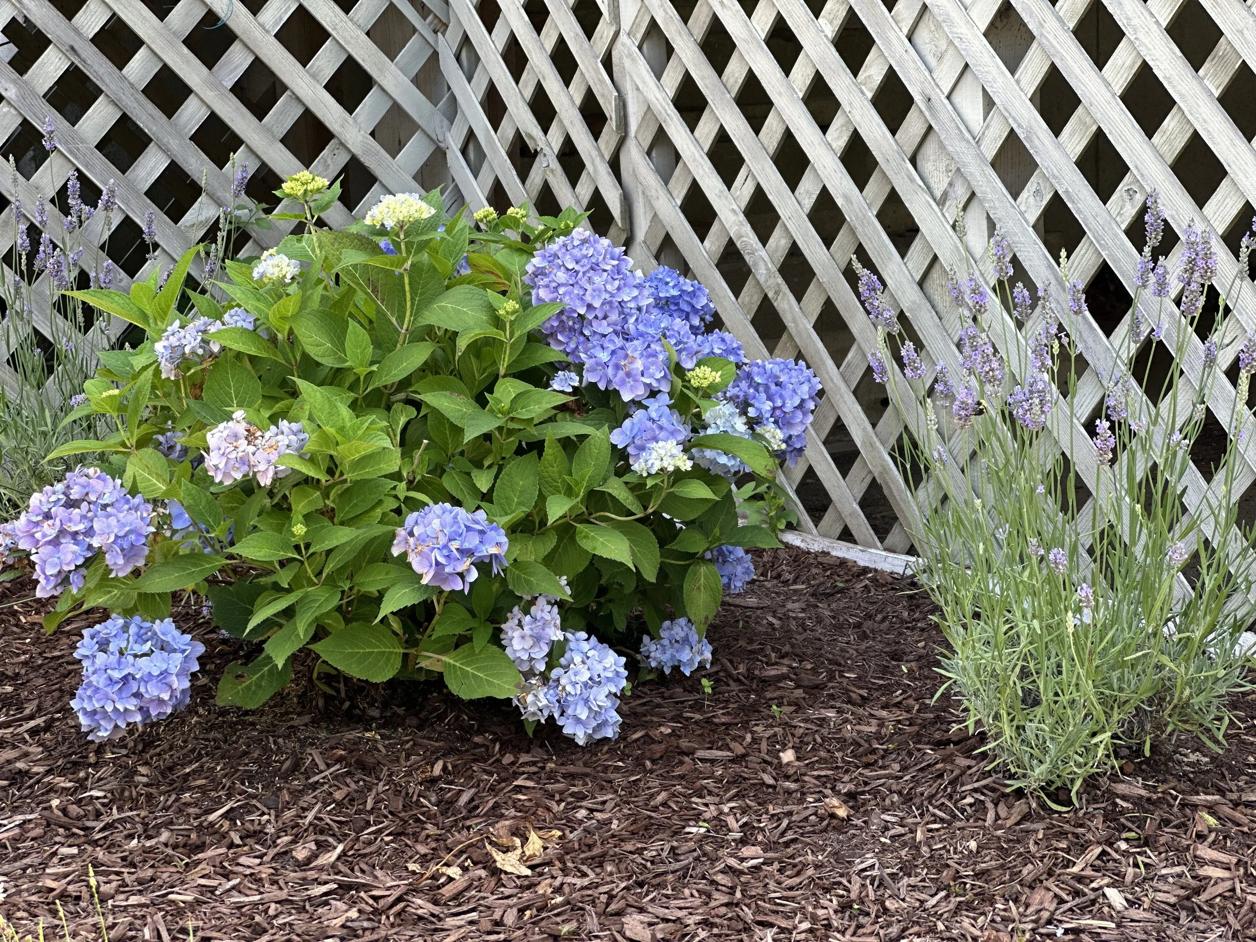 Side Accent Bed: One new Hydrangea macrophylla + two new English lavender framing an existing hydrangea with freshened edging for visual cohesion.